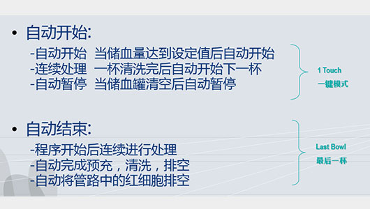 独有的双RBC探头技术保证了高红细胞回收率,清洗后高HCT和高的清洗质量,使用优化程序(Opopt)程序可获得最佳清洗质量